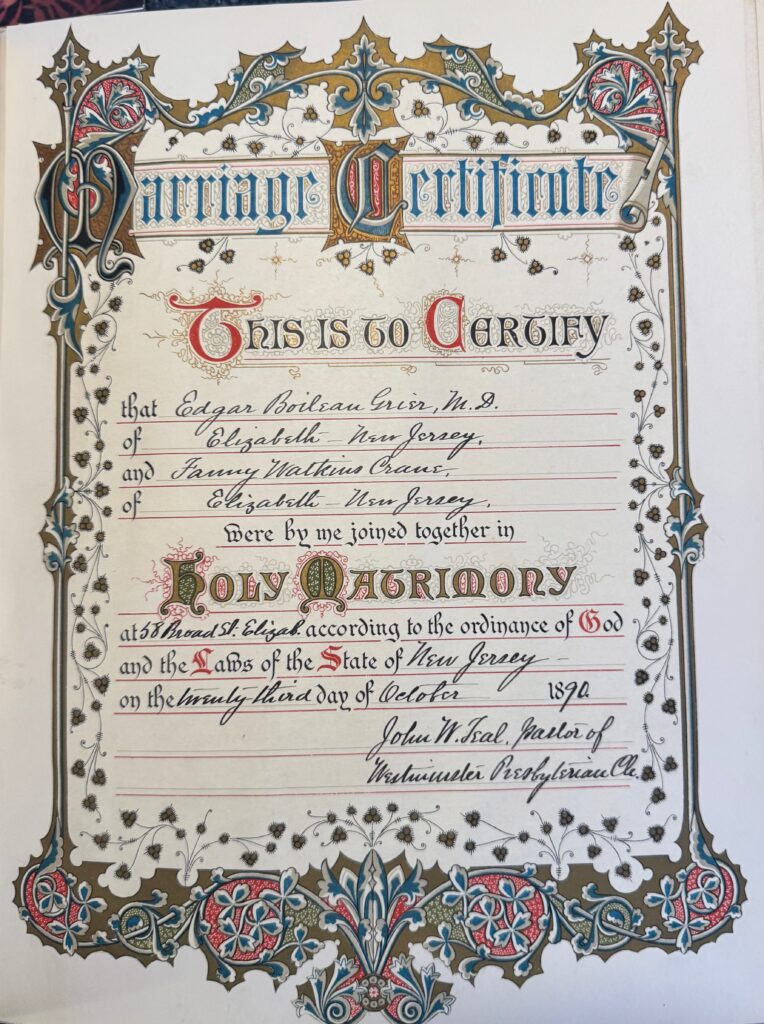 In October 1890 Dr. Grier married Fanny Crane, daughter of Dr. Job S. Crane and Helen (Watkins) Crane. Their marriage was an elaborate affair.